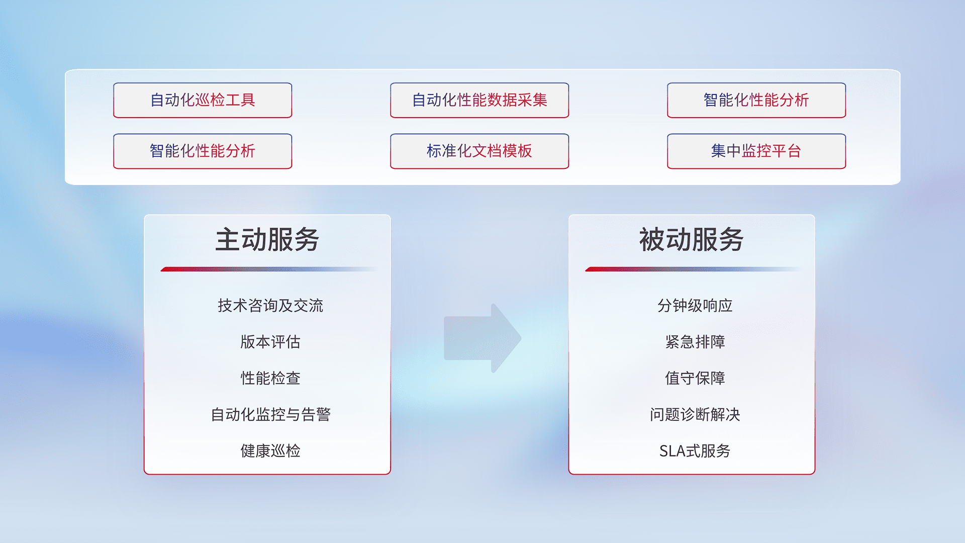 智能化工具和标准化文档,,,,保障服务质量,,,,提供主动服务(包含技术咨询、、版本评估、、、、性能检查、、、、自动化监控与告警、、、、健康巡检)和被动服务包含(分钟级响应、、紧急排障、、值守保障、、问题诊断解决、、SLA服务)。。